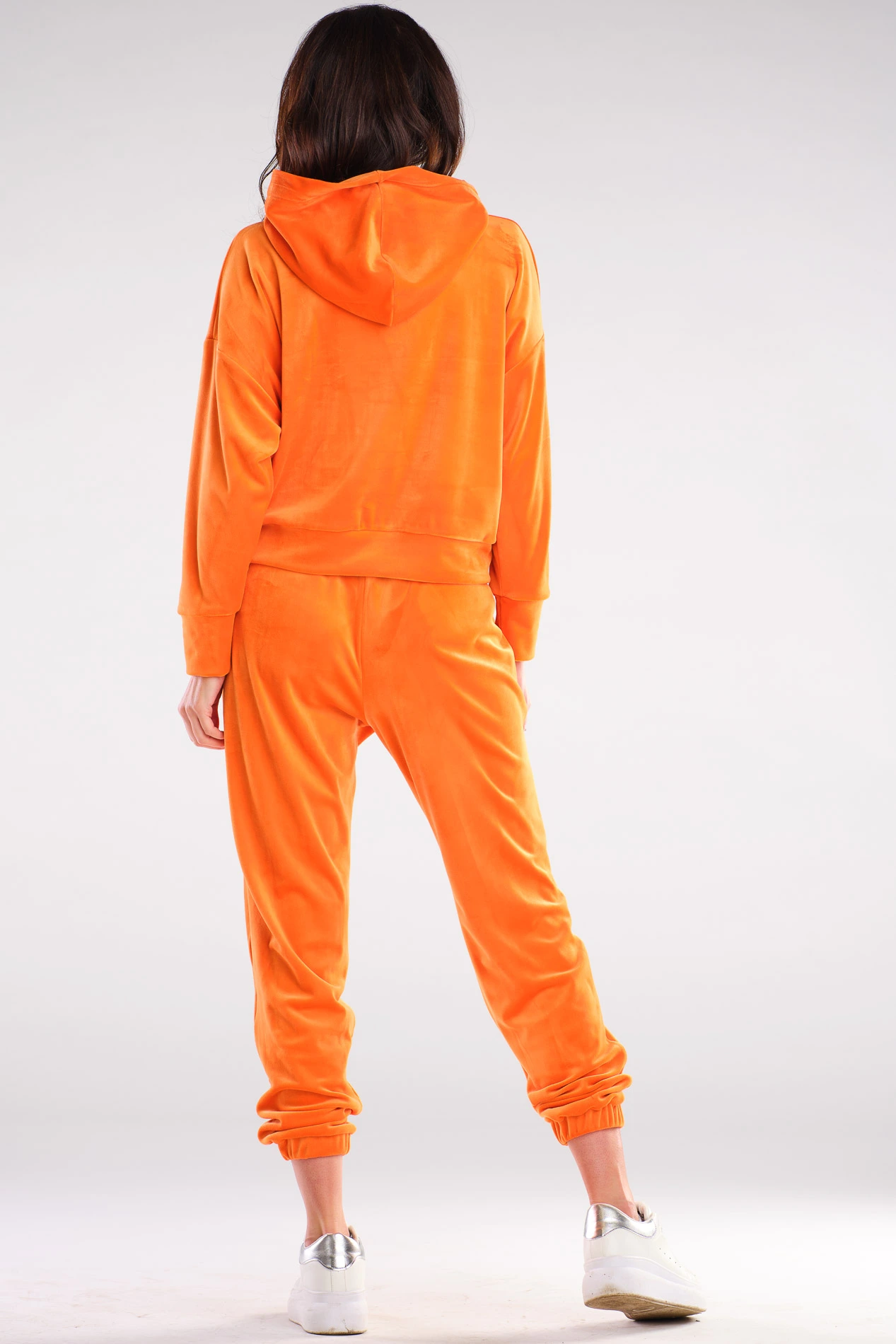 Stylowy, dwuczęściowy komplet w intensywnie pomarańczowym kolorze to propozycja dla kobiet, które szukają wygody z modowym twistem. Miękki, lekko połyskujący welur przyjemnie otula ciało, a swobodny krój gwarantuje pełną swobodę ruchów – sprawdzi się w miejskich stylizacjach, podczas home office oraz na weekendowych wyjazdach. Luźna bluza z obniżoną linią ramion i ściągaczami na rękawach łączy się ze spodniami typu jogger, które mają elastyczną talię na gumie, boczne kieszenie i ściągacze przy kostkach. Całość tworzy nowoczesny total look w energetycznym odcieniu, który łatwo wystylizujesz ze sportowymi sneakersami, cięższymi botkami lub płaszczem oversize.