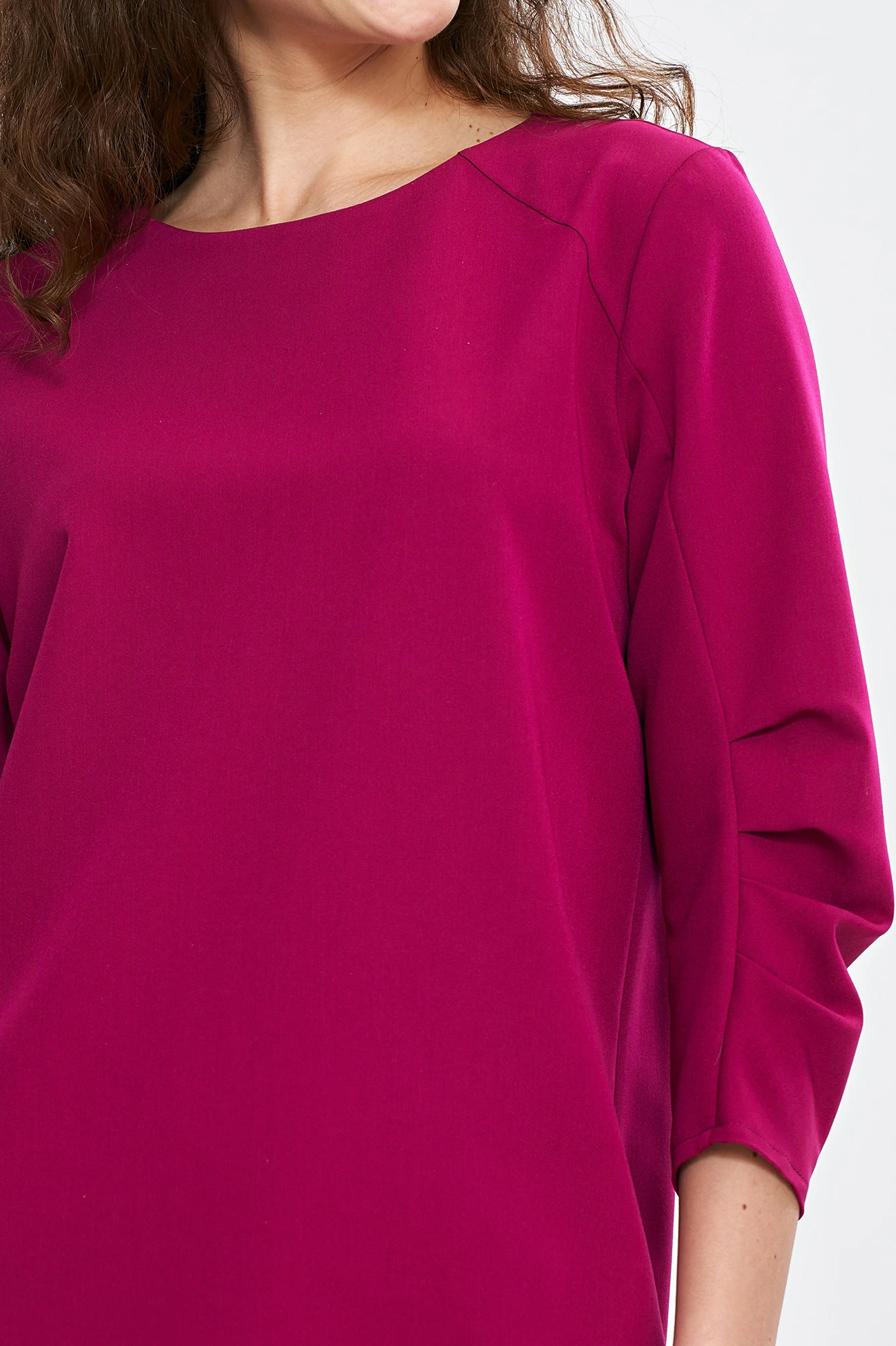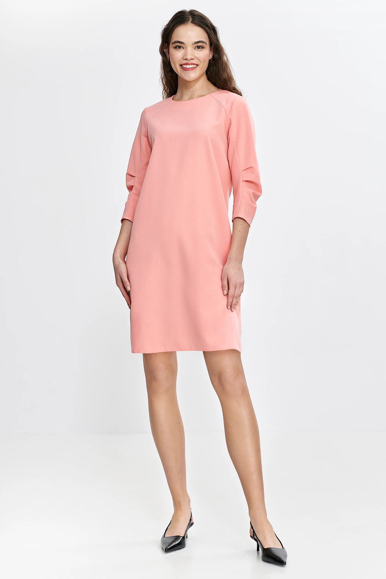 Model posiada rękawy o długości ¾ z subtelnymi zakładkami przy łokciach, które nadają całości ciekawy, architektoniczny akcent. Okrągły dekolt i brak dodatkowych zdobień sprawiają, że sukienka zachwyca swoją prostotą i klasą. Długość przed kolano podkreśla kobiecą sylwetkę, a zapięcie z tyłu na kryty suwak zapewnia wygodne zakładanie. To idealna baza do stylizacji z eleganckimi dodatkami, jak i modnych, casualowych looków.
