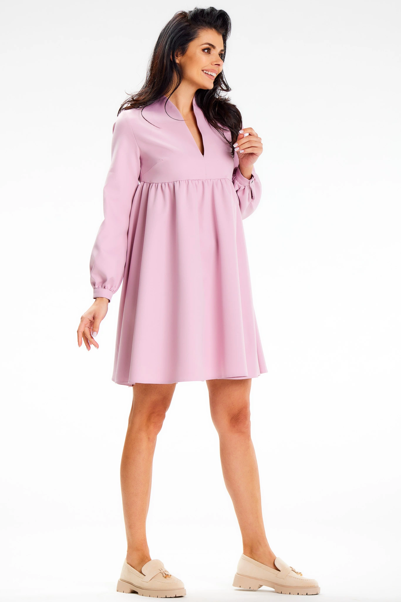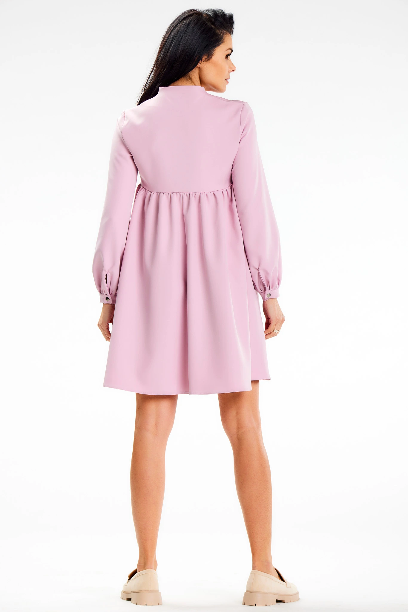 Pudrowo-różowa sukienka trapezowa z długim rękawem – idealna na komunię. Pudrowo-różowa sukienka o eleganckim, minimalistycznym charakterze to świetny wybór na uroczystość Pierwszej Komunii Świętej. Jasny, subtelny odcień pięknie prezentuje się na zdjęciach i doskonale wpisuje się w komunijny dress code. Trapezowy fason z odcięciem pod biustem delikatnie układa się na sylwetce, zapewniając komfort przez cały dzień. Dekolt w formie lekkiego V dodaje lekkości i optycznie wysmukla górę, zachowując przy tym klasyczną elegancję. Długie rękawy z mankietem podkreślają wizytowy styl, a długość przed kolano sprawia, że kreacja wygląda schludnie i stosownie. To sukienka, która łączy wygodę z dopracowanym wyglądem na ważną rodzinną okazję.