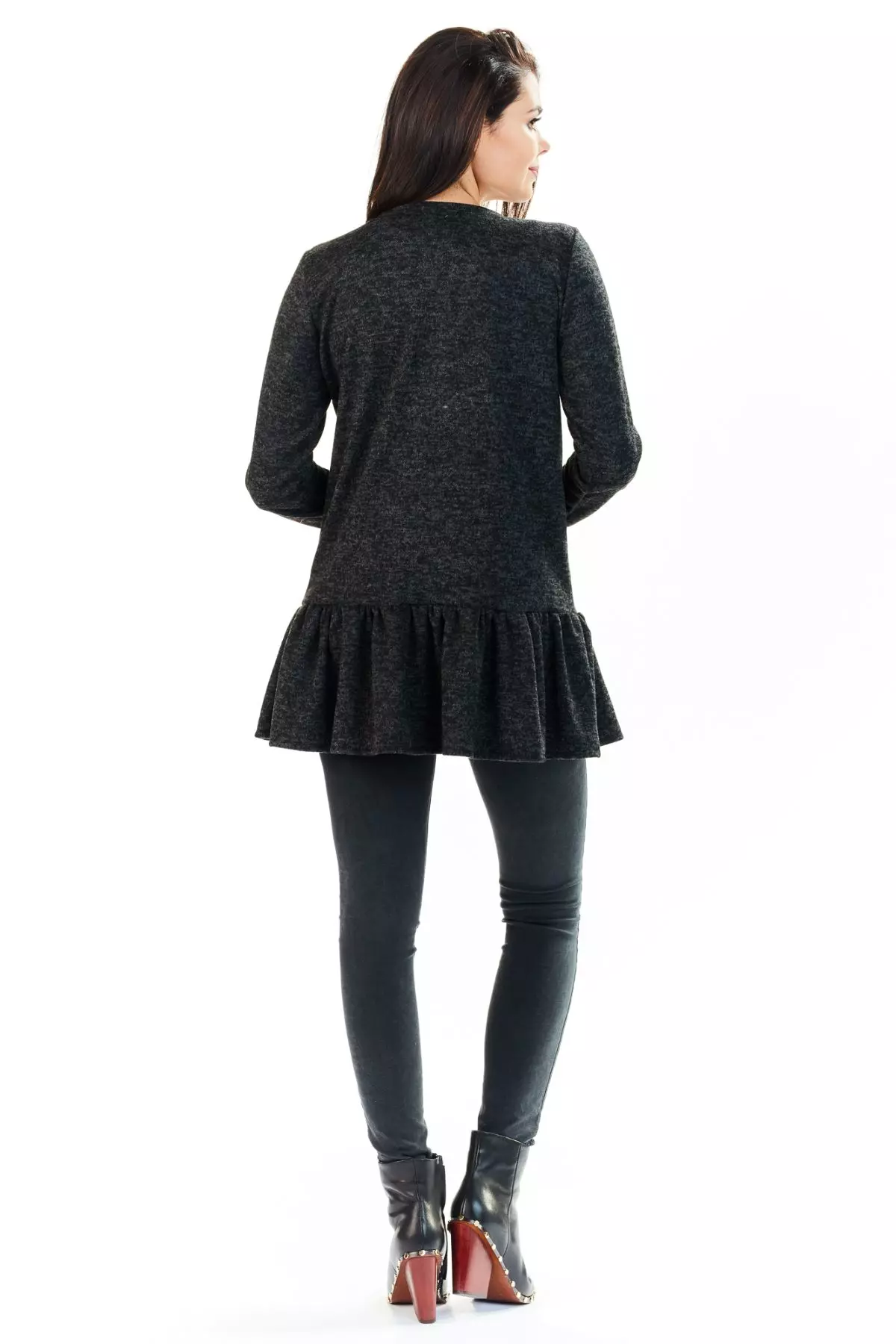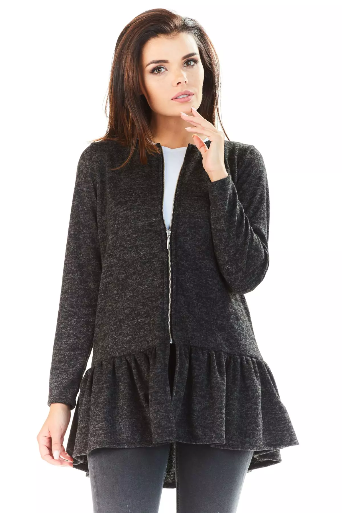 Rozpinany sweter damski z falbanką na dole