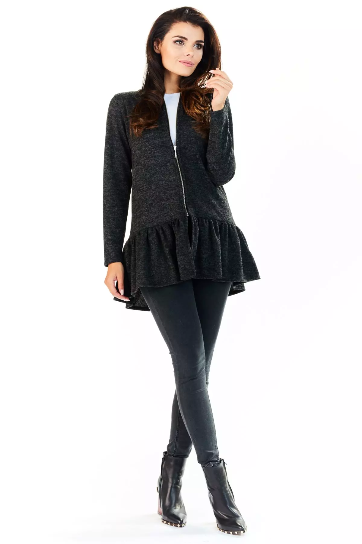Rozpinany sweter damski z falbanką na dole , wykonany z wysokiej jakości materiału, który zapewnia komfort i ciepło w chłodniejsze dni. Sweter posiada klasyczny krój, idealnie dopasowujący się do sylwetki, podkreślając jej kształty, a jednocześnie nie ograniczając swobody ruchów. Dodatkowym atutem jest subtelna struktura materiału, która nadaje mu wyjątkowego charakteru. Sweter sprawdzi się zarówno w casualowych stylizacjach, jak i w bardziej formalnych zestawieniach, doskonale komponując się z eleganckimi spodniami, jak i jeansami. Jest to doskonały wybór na codzienne wyjścia, spotkania biznesowe oraz bardziej swobodne okazje.