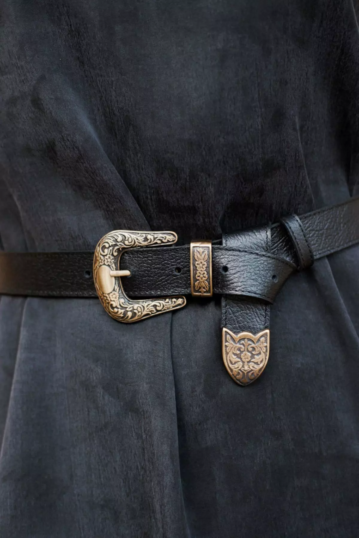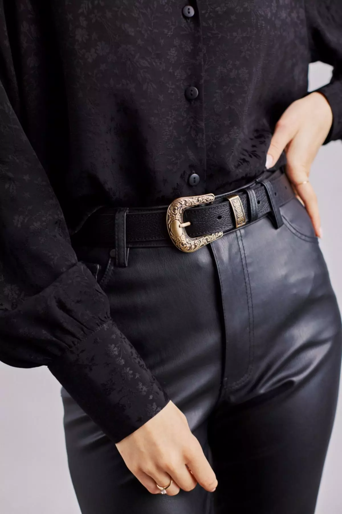 Czarny skórzany pasek damski z ozdobną klamrą w stylu western to wyjątkowy czarny skórzany pasek, który doda charakteru każdej stylizacji. Wykonany z najwyższej jakości naturalnej skóry, ten pasek łączy w sobie trwałość i styl, stając się idealnym dodatkiem do wielu różnych ubrań. Pasek wyróżnia się bogato zdobioną klamrą oraz metalowymi detalami w stylu western, które dodają mu unikalnego i rustykalnego uroku. Delikatne, kwieciste wzory na klamrze, szlufce oraz zakończeniu paska czynią go niezwykle efektownym i eleganckim. Dzięki regulowanym dziurkom pasek można łatwo dopasować do różnych sylwetek, zapewniając idealne dopasowanie i komfort noszenia.