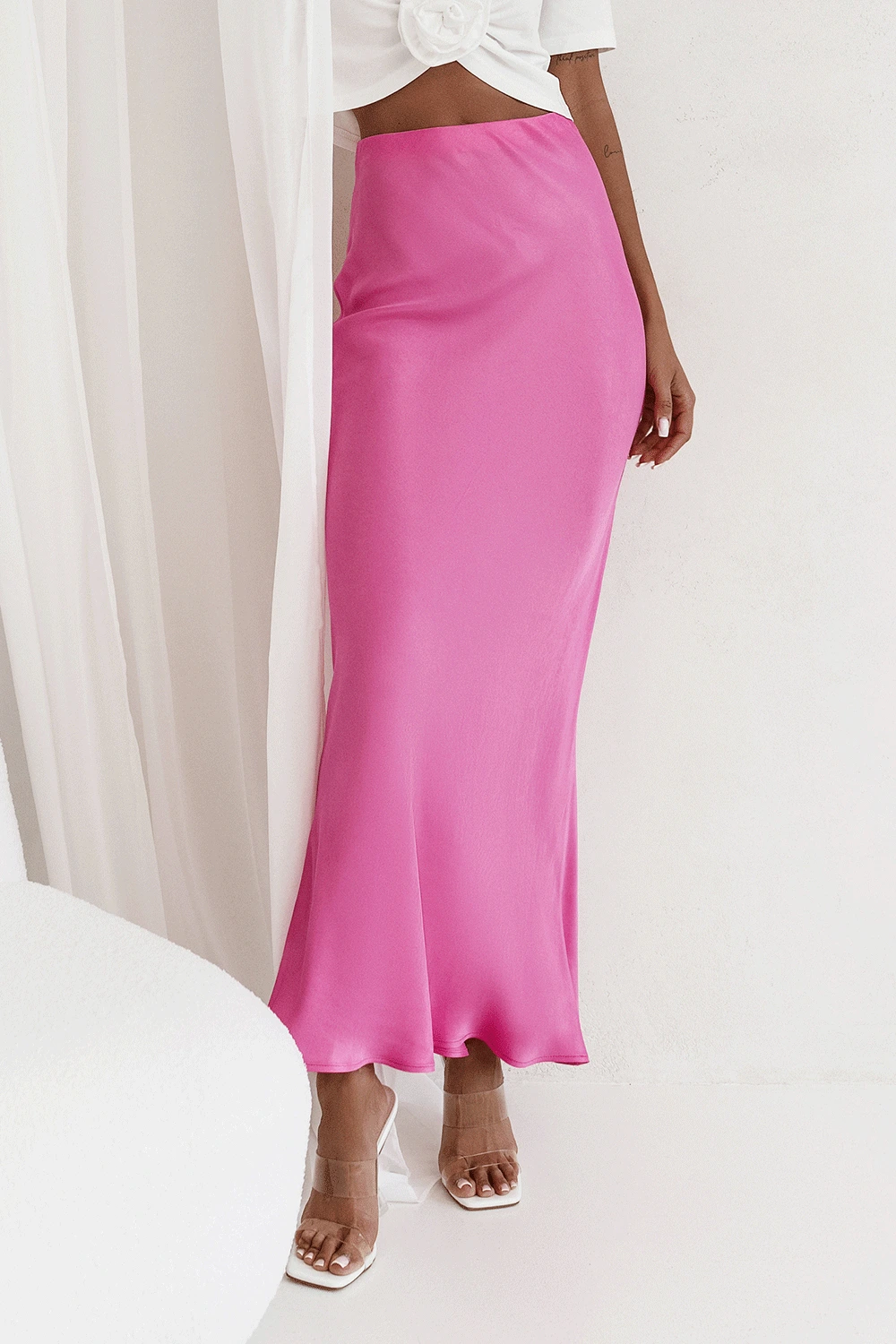 Zmysłowa i kobieca spódnica o długości midi, wykonana z lekkiej, przyjemnej w dotyku tkaniny o lekko połyskującym wykończeniu. Model pięknie układa się na sylwetce, podkreślając talię i wysmuklając nogi. Delikatny połysk oraz miękki, lejący materiał dodają całości elegancji. Gładki pas bez zapięcia zapewnia komfort przez cały dzień i świetnie dopasowuje się do sylwetki. Minimalistyczny krój sprawia, że świetnie komponuje się zarówno z klasycznym T-shirtem, jak i elegancką bluzką. Idealna propozycja na co dzień, do biura oraz na wyjątkowe okazje.