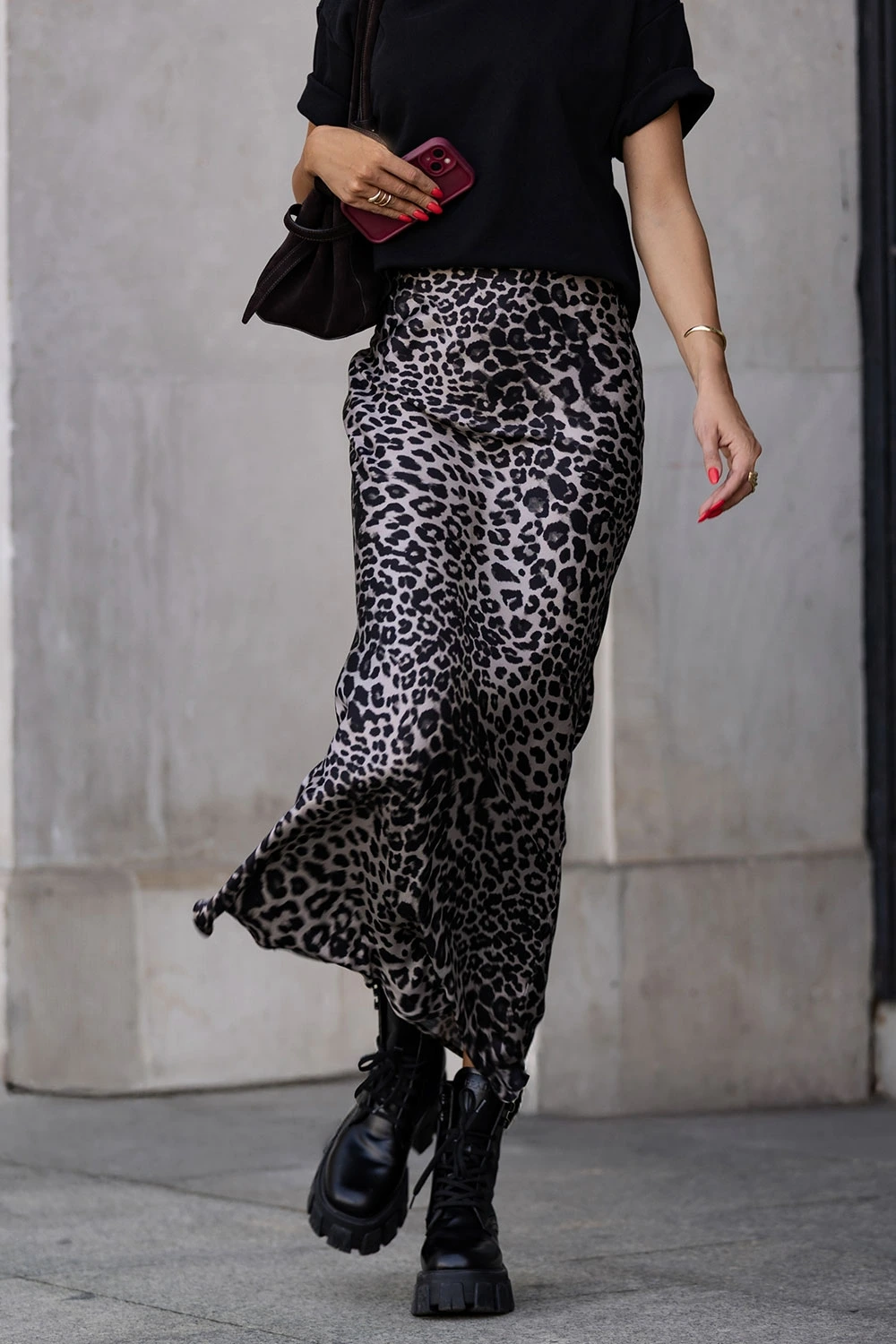 Ta satynowa spódnica midi w panterkę to gotowy sposób na efektowną stylizację bez wysiłku. Dzięki elastycznej talii miękko dopasowuje się do figury, a delikatnie rozszerzany fason pięknie pracuje podczas chodzenia, wysmuklając nogi. Śliska satynowa powierzchnia nadaje całości szlachetny połysk, który świetnie wygląda zarówno w zestawie z prostym T-shirtem i cięższymi botkami, jak i z dopasowanym topem oraz sandałkami na obcasie. Model sprawdzi się do biura (z marynarką), na spotkania po pracy oraz na wyjścia – wystarczy zmienić dodatki. To ponadczasowa spódnica w zwierzęcy print, która łatwo buduje styl smart-casual i szybko staje się bazą wielu stylizacji kapsułowych. Idealna dla osób ceniących wygodę, kobiecy krój i modny, ale wciąż uniwersalny charakter.