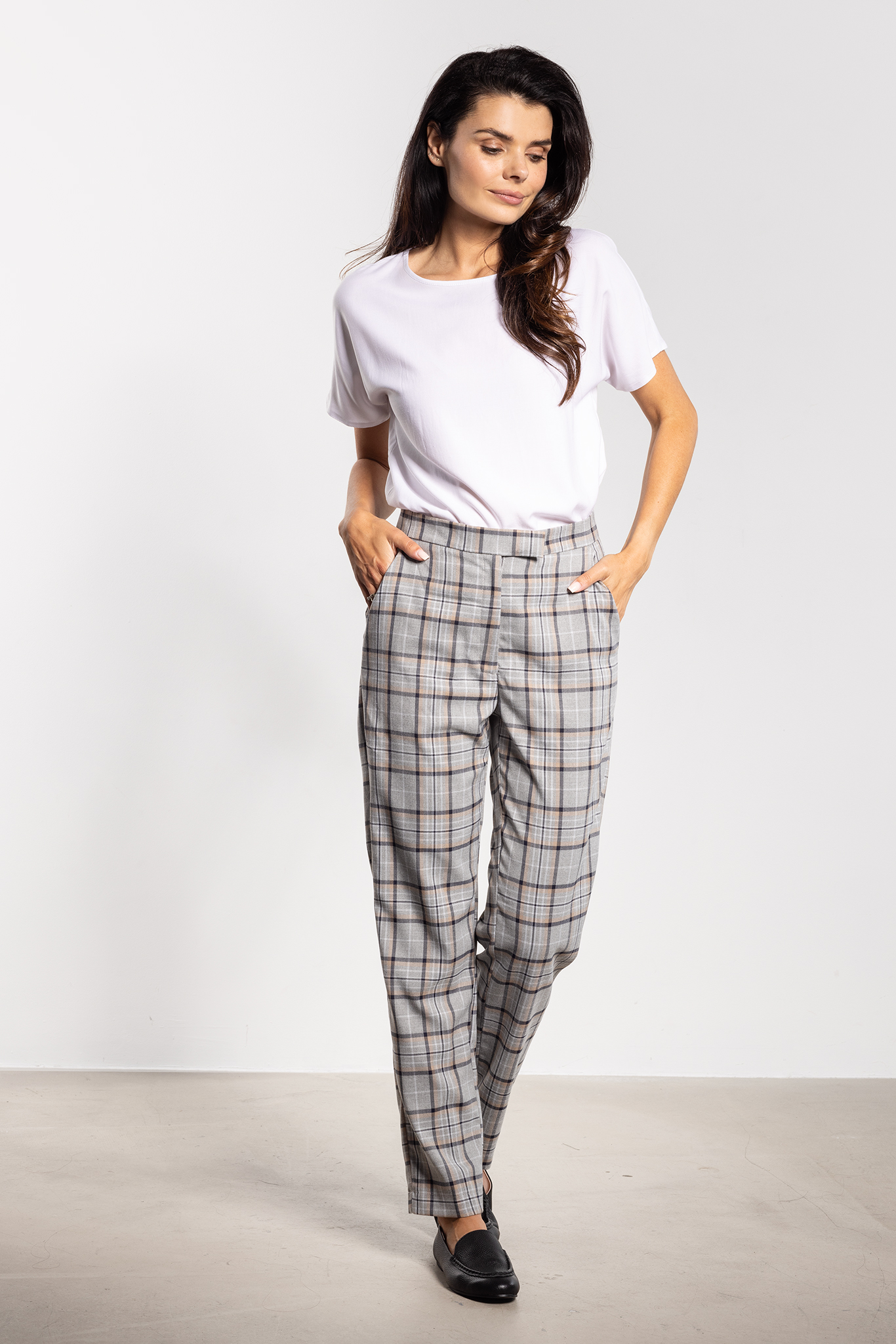 Stylowe spodnie w kratę o prostym kroju. Prosty fason pięknie układa się na sylwetce, a średni stan zapewnia wygodę i komfort noszenia przez cały dzień. Elegancki wzór w kratę dodaje charakteru i sprawia, że spodnie doskonale sprawdzą się zarówno w stylizacjach biurowych, jak i codziennych. Praktyczne kieszenie boczne zwiększają funkcjonalność, a uniwersalny design pozwala łączyć je z koszulą, swetrem czy marynarką, tworząc efektowne zestawy na różne okazje.
