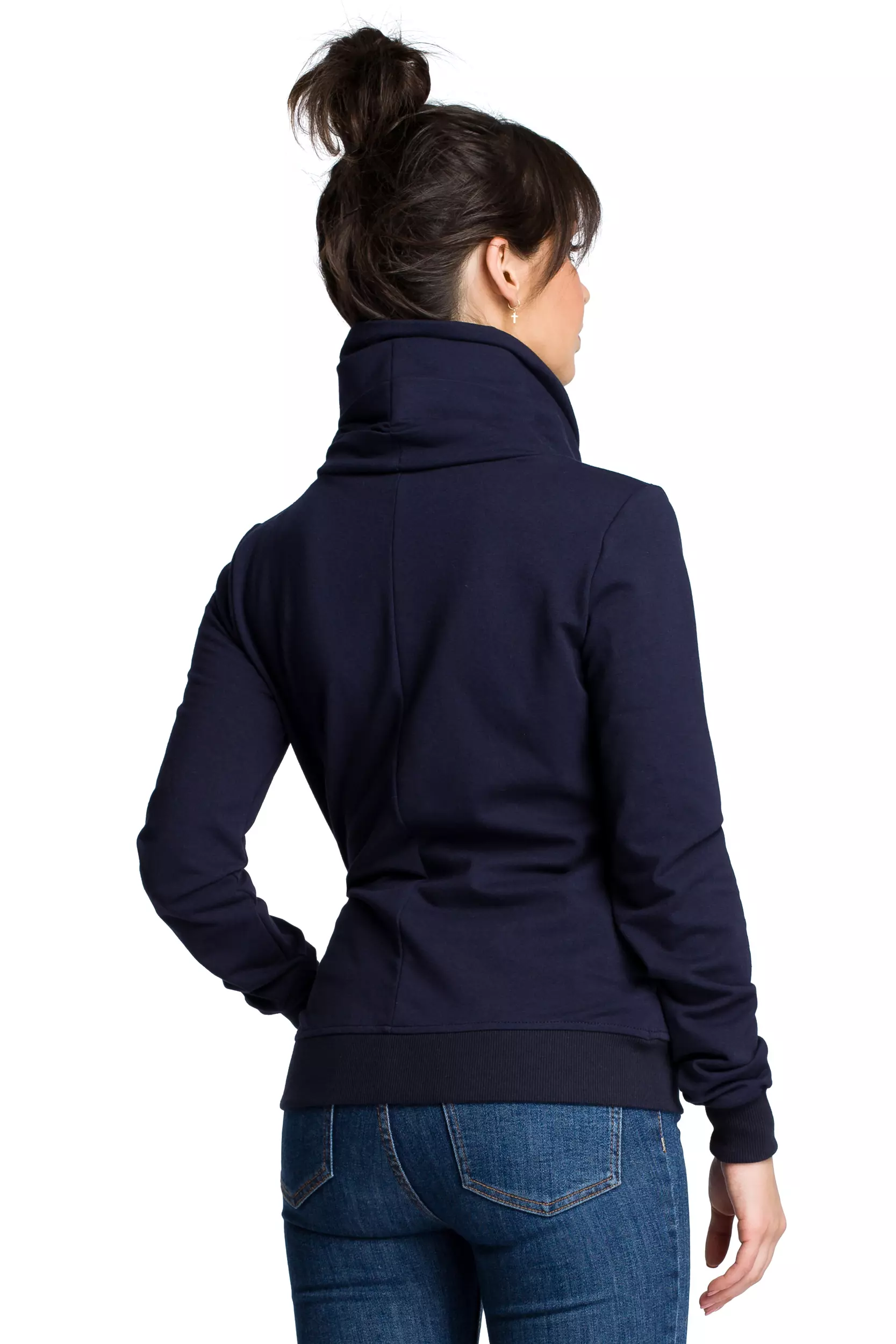 Sportowa bluza z wysokim kołnierzem z zakładkami to doskonały wybór na co dzień, na spacer w miejskiej dżungli czy w parku, czy też na poranny jogging. Niezależnie od tego, kiedy jej potrzebujesz bluza zawsze spełni Twoje oczekiwania, gdy poszukujesz czegoś ciepłego i zarazem wygodnego. Proponowany model został wyposażony w wysoki kołnierz z ciekawym drapowaniem oraz kontrastowy, ukośnie wszyty zamek, przyciągający wzrok postronnych obserwatorów. Fason jest dopasowany do sylwetki na tyle, aby uwypuklić kobiece walory i jednocześnie zadbać o funkcjonalny komfort. Na dole i długich rękawach dumnie wdzięczy się praktyczny ściągacz. Bluza z bawełny z kołnierzem została wyposażona w kieszenie, które znajdują się po bokach, w szwach.