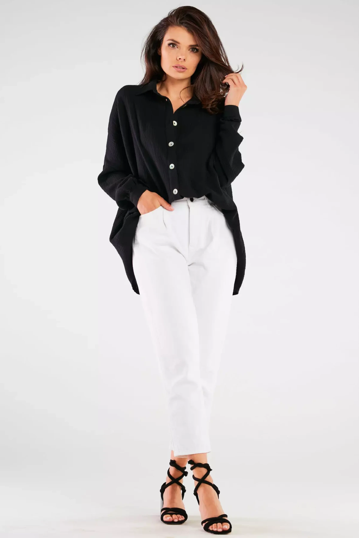 Stylowa koszula damska oversize z kołnierzykiem, która łączy klasyczny design z nowoczesnym stylem. Dzięki luźnemu krojowi i delikatnej bawełnie zapewnia wygodę przez cały dzień. Z przodu znajduje się szereg ozdobnych guzików, a rękawy zakończone są ściągaczami, co dodaje jej lekkości i elegancji. Można ją nosić zarówno na co dzień, jak i do biura. Jej ponadczasowy krój sprawia, że będzie doskonałą podstawą wielu casualowych i formalnych stylizacji.