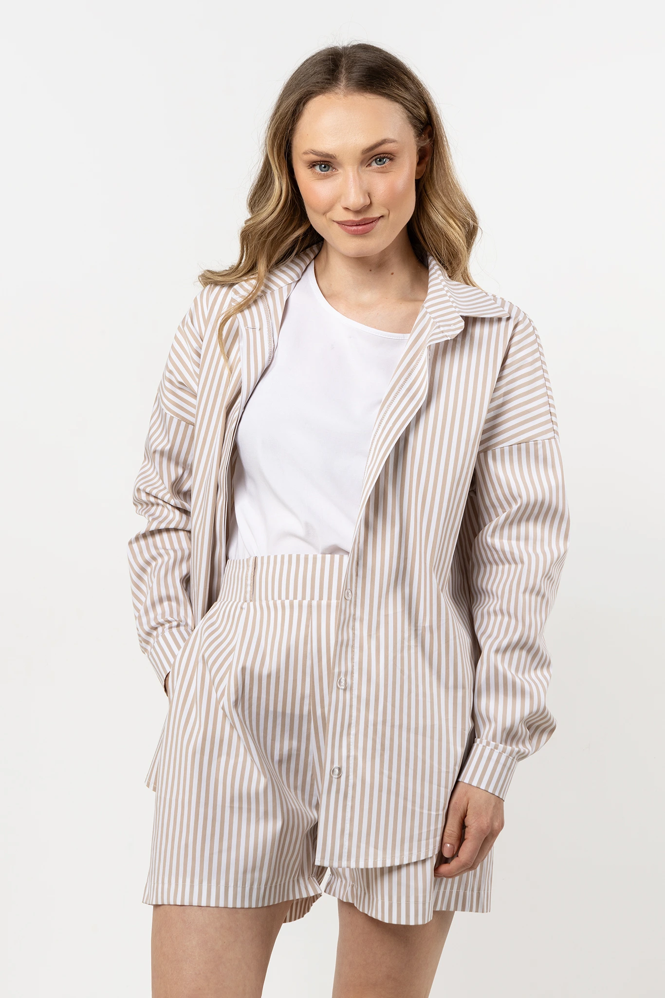Dwuczęściowy komplet składający się z luźnej koszuli i krótkich spodenek to wygodna i stylowa propozycja na ciepłe dni. Uszyty z lekkiego, przewiewnego materiału, zapewnia komfort noszenia nawet w największe upały. Klasyczny wzór w pionowe paski optycznie wysmukla sylwetkę, a neutralna kolorystyka sprawia, że komplet można łatwo zestawić z innymi elementami garderoby.