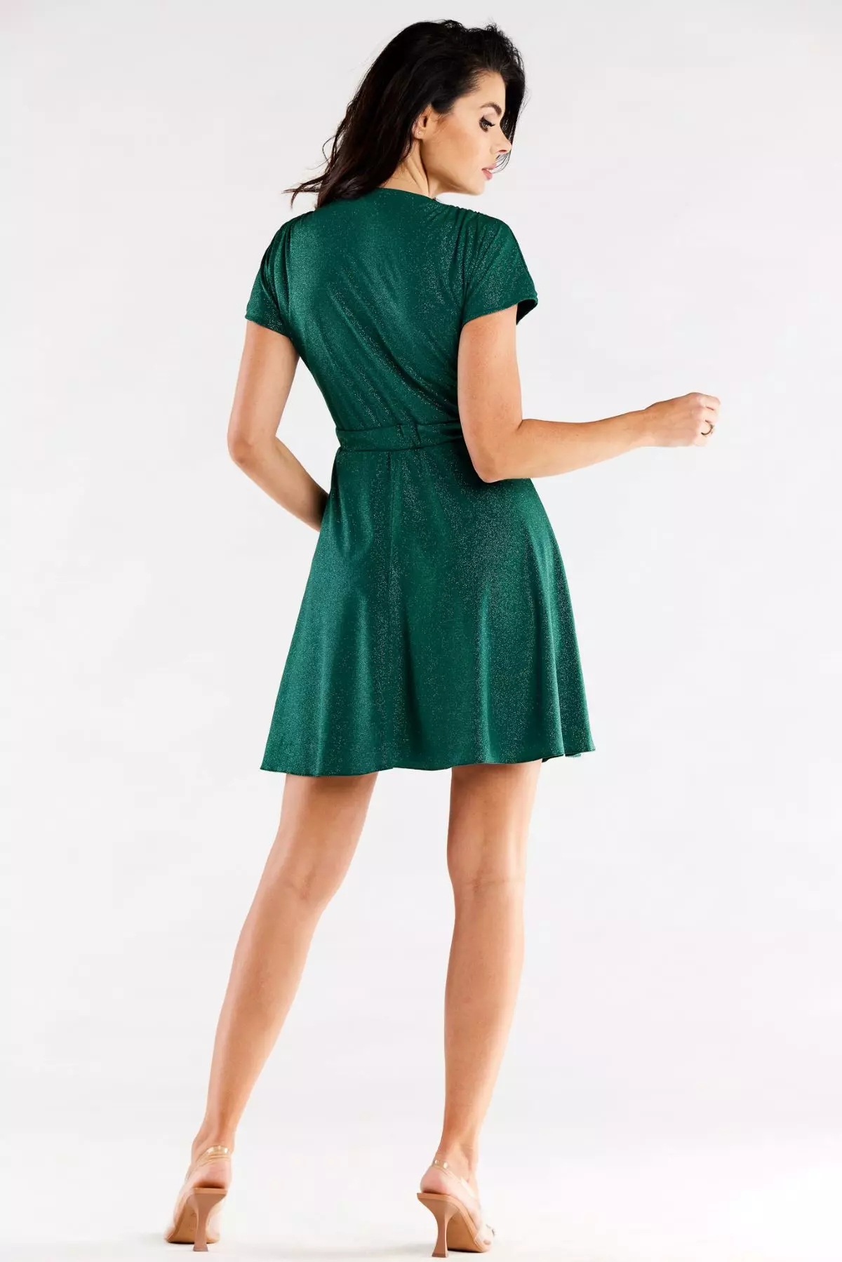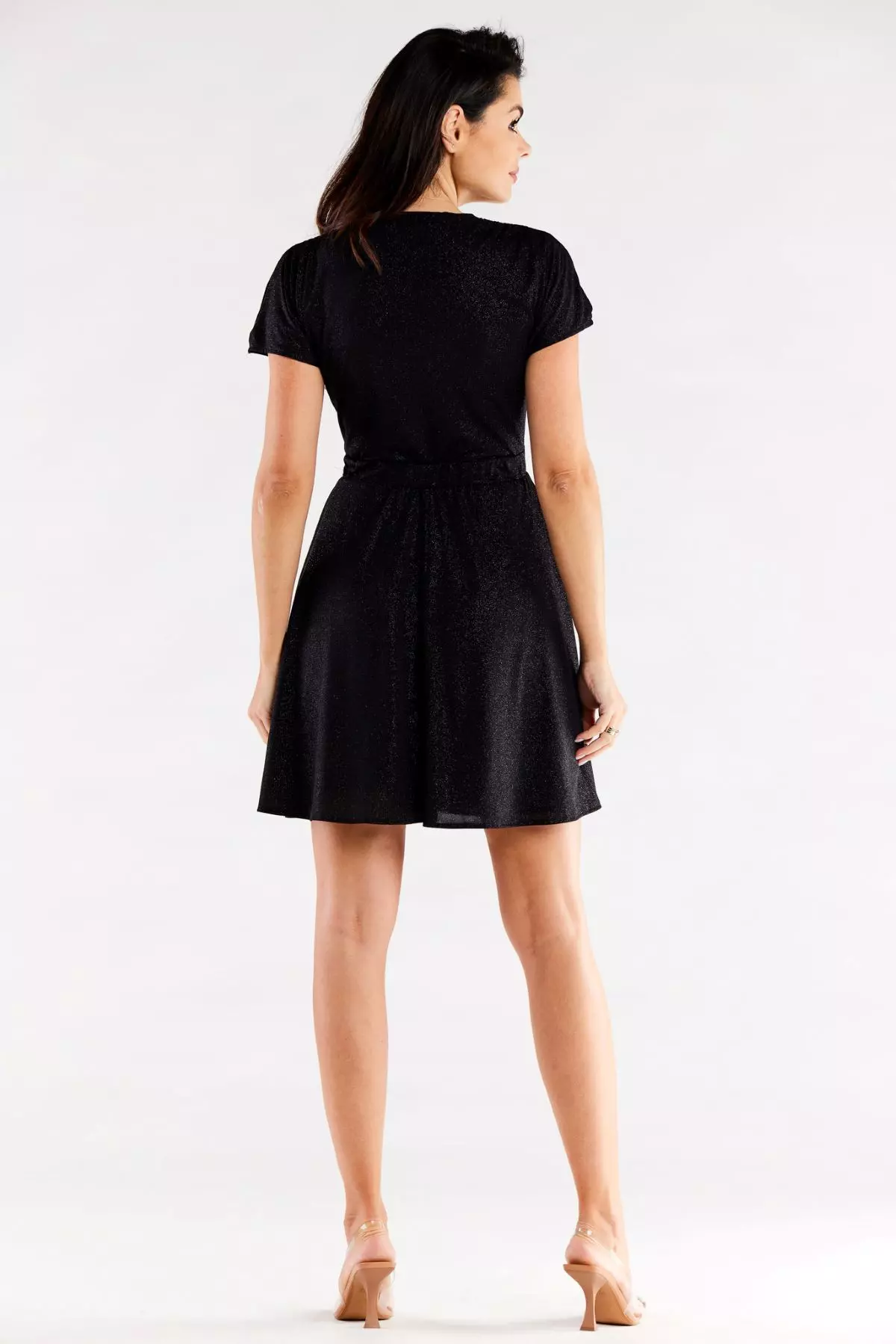 Sukienka błyszcząca na wesele  to model, który bez wątpienia przykuje uwagę miłośniczek efektownych kreacji. Kopertowy dekolt subtelnie eksponuje biust i linię obojczyków, idealnie współgrając z krótkim rękawem. W talii posiada elastyczną gumkę, która nie tylko zjawiskowo zaznacza talię, ale również wyrównuje proporcje sylwetki. Lekkości i dziewczęcego wdzięku nadaje całości rozkloszowany dół, który idealnie odnajdzie się w towarzystwie modnych sandałek na koturnie. Sukienki błyszczące na wesele stały się modowym hitem już od kilku sezonów.