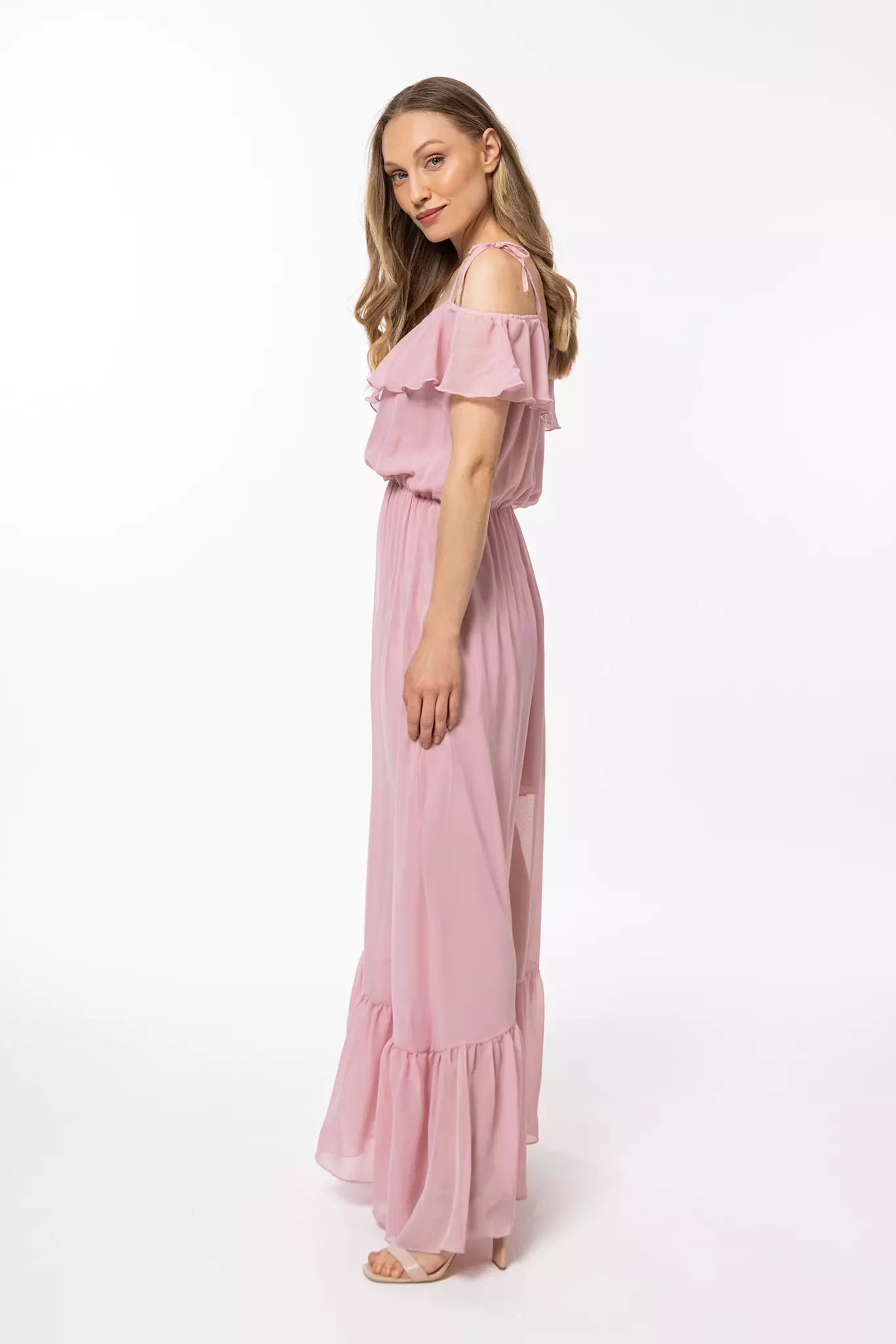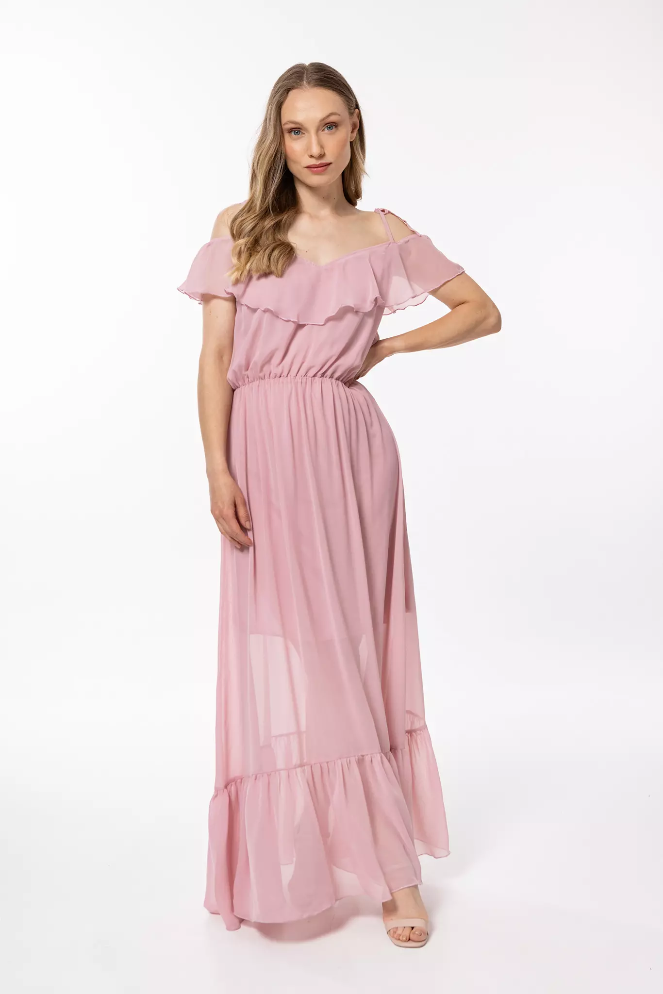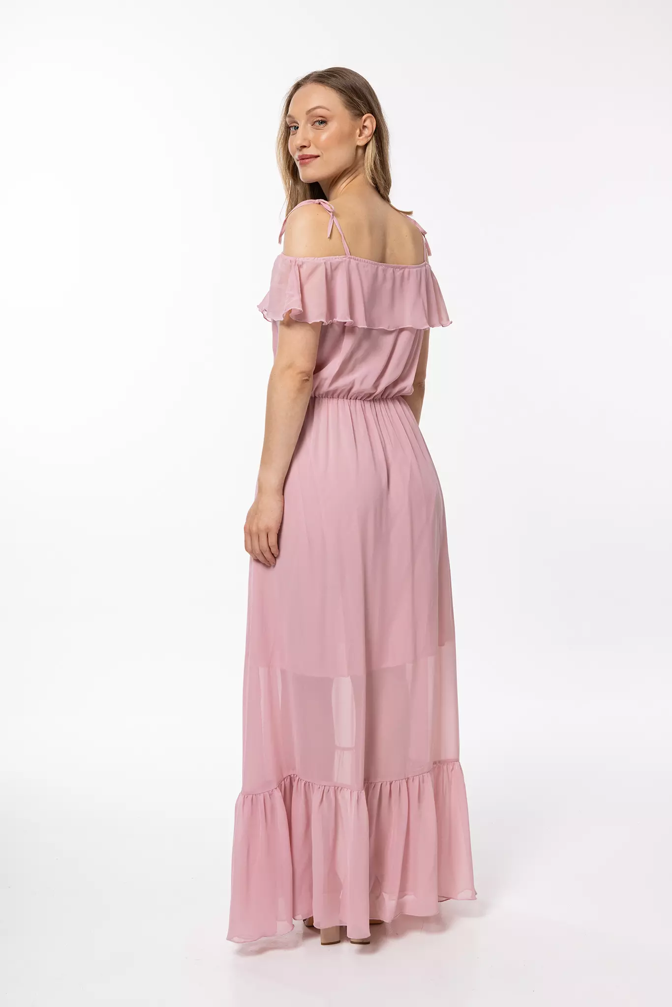 Romantyczna sukienka maxi to zwiewna propozycja na różnego rodzaju wyjścia. Hiszpański dekolt z wiązanymi tasiemkami subtelnie odsłania ramiona, a gumka w pasie podkreśla talię i proporcje sylwetki. Krótka podszewka zapobiega prześwitywaniu, a dół oraz dekolt zdobią efektowne falbany. Ten model w stylu boho sprawdzi się na wiele okazji od wesela, przez romantyczną randkę, po wieczorne wyjście podczas wakacyjnego wyjazdu. Krój pięknie układa się w ruchu, dzięki czemu w nienachalny sposób ściągnie na siebie wiele przychylnych spojrzeń.
