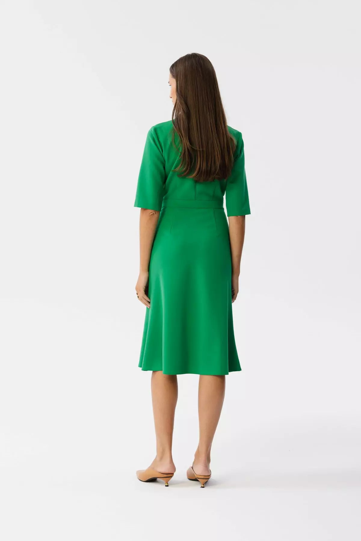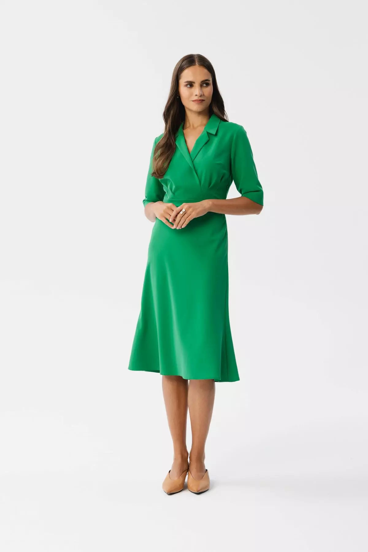 Sukienka koktajlowa o długości midi zapewne zachwyci Cię swoim wyjątkowym designem! Jej interesujące elementy, takie jak dekolt typu kołnierzyk oraz wyrazisty detal w postaci falowanej spódnicy, sprawią, że będziesz emanować pewnością siebie i stylem. Sukienka ma długość za kolano, co czyni ją doskonałym wyborem na różnego rodzaju okazje, począwszy od formalnych spotkań, aż po okolicznościowe przyjęcia. Nie trać czasu na długie rozważania nad wyborem stroju na imprezę. Nasza zielona sukienka koktajlowa w stylu midi to klucz do niezapomnianej stylizacji, która podkreśli Twoją niepowtarzalność!