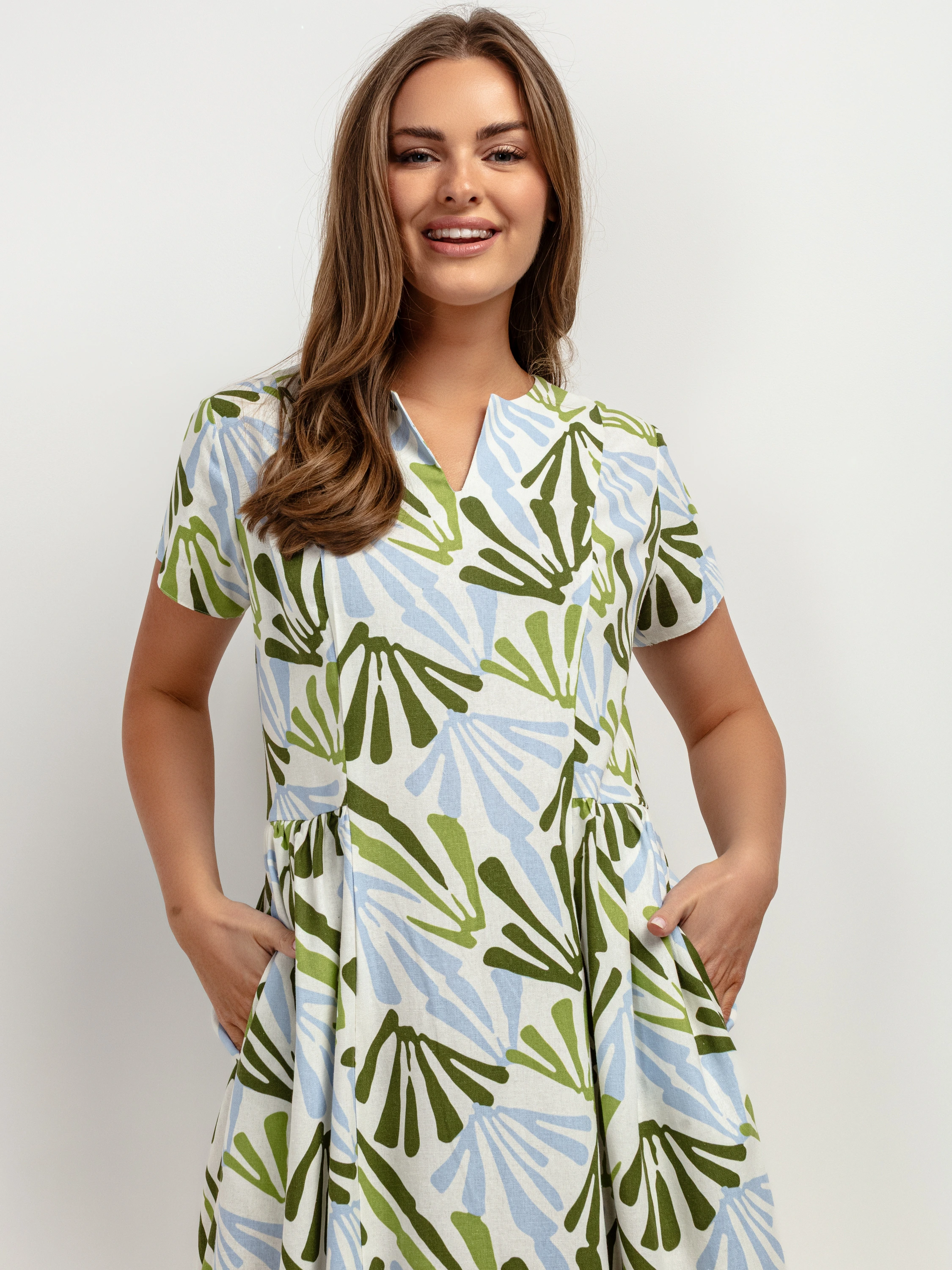 Z przodu znajduje się stylowy, niewielki kołnierzyk w kształcie litery V, który delikatnie eksponuje dekolt i dodaje całości eleganckiego charakteru. Ukryte po bokach funkcjonalne kieszenie nadają sukience praktyczny wymiar, zachowując jednocześnie jej lekki i nieformalny charakter.