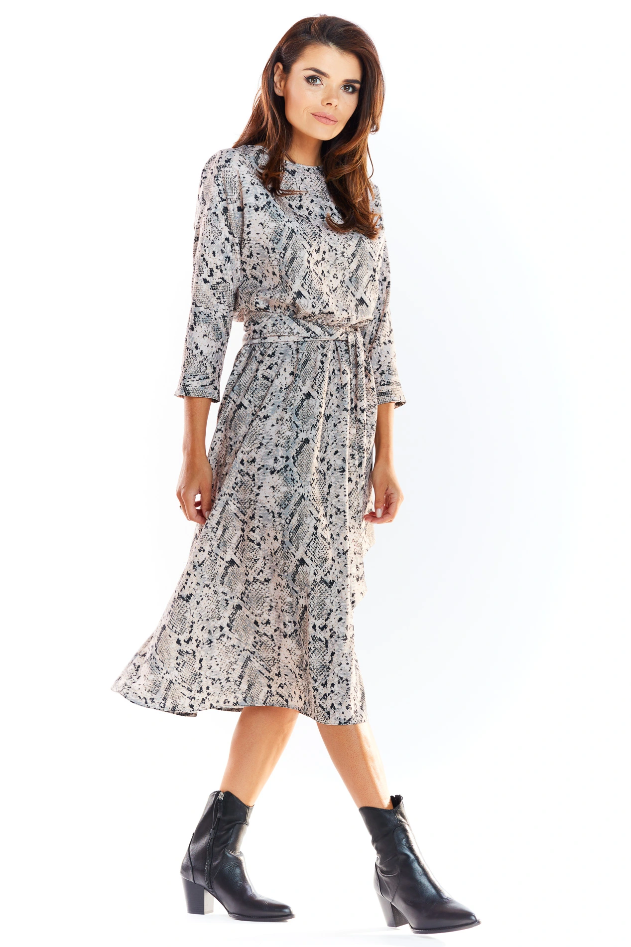 Wiązana w talii sukienka midi, która doda świeżości i uroku Twojej garderobie. Wykonana z przewiewnej tkaniny, sukienka ta łączy w sobie wygodę i styl, idealnie sprawdzając się zarówno na co dzień, jak i na specjalne okazje. Sukienka posiada okrągły dekolt oraz rękawy 3/4, które dodają jej klasy. Wiązanie w talii podkreśla sylwetkę, a luźny dół zapewnia swobodę ruchów i lekkość. Wzór przyciąga wzrok i nadaje sukience wyrazistego charakteru. Idealna do noszenia z botkami, sandałami czy eleganckimi szpilkami, ta sukienka stanie się Twoim ulubionym elementem garderoby na letnie dni i wieczorne wyjścia. Połącz ją z minimalistycznymi dodatkami, aby podkreślić jej unikalny wzór i styl.