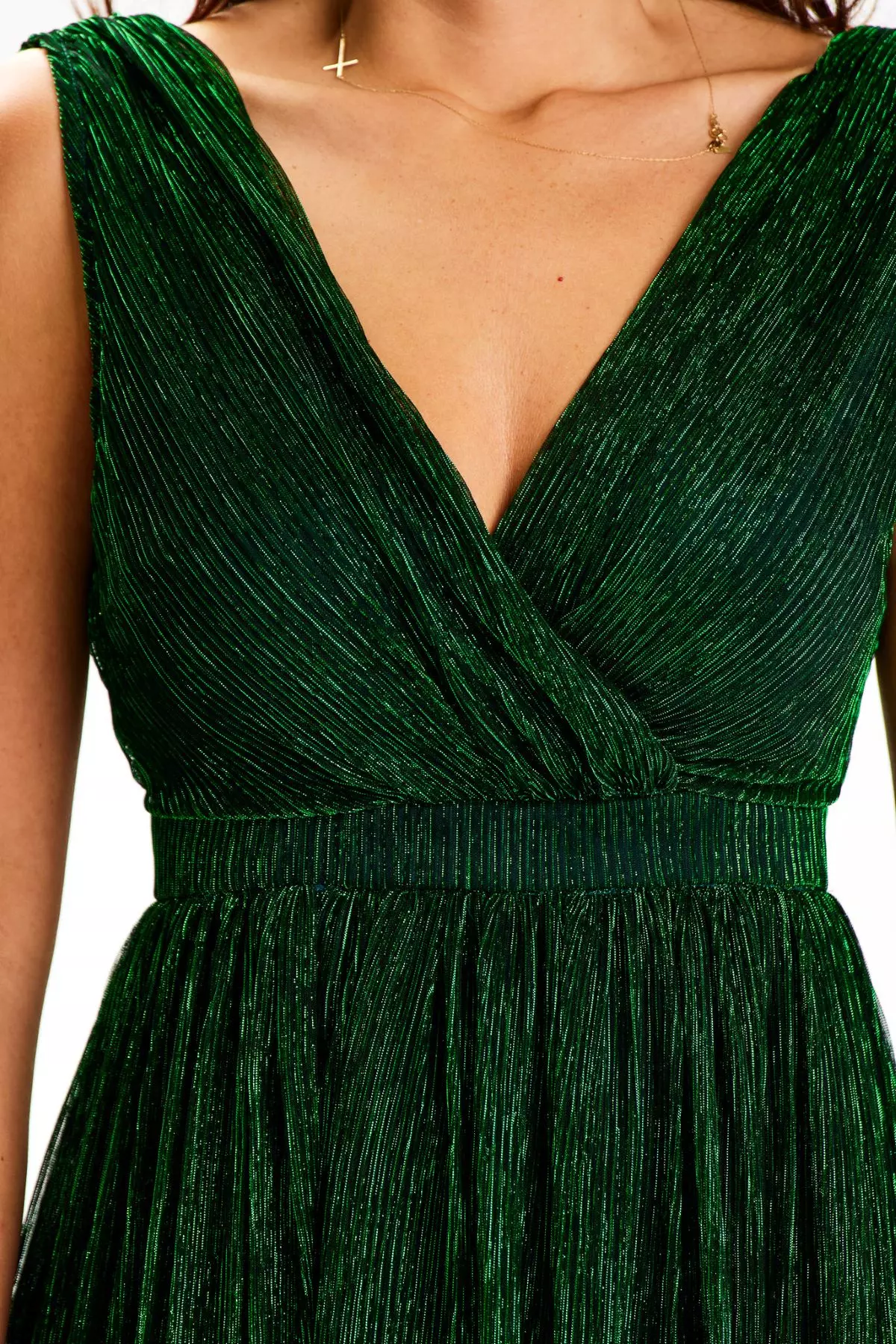Zielona sukienka na wesele długa błyszcząca to model, który idealnie dopasuje się do każdej sylwetki. Długość do kostek, głęboki zielony kolor oraz materiał z połyskującą fakturą, dodają całości szyku i elegancji. W pasie wszyto gumkę, która podkreśla sylwetkę. Sukienka ma atrakcyjny, głęboki dekolt z przodu, jak i z tyłu w kształcie litery V oraz zmysłowe wycięcie na dole, które odsłania nogę, nadając kreacji elegancki, ale i odważny charakter. Transparentny materiał dodaje lekkości i zwiewności, sprawiając, że jest to idealna propozycja na eleganckie przyjęcie weselne.